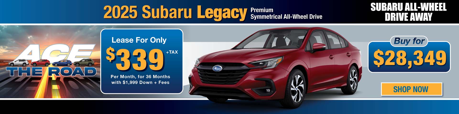 Lease a new 2025 Subaru Legacy for $339/month +tax on a 36-month lease (Model SAD11). Due at signing: $1,999 down plus fees. $0 security deposit. MSRP of $30,449 (incl. $1,420 Destination & Delivery charge). Net cap cost of $28,349. Retailer contribution $2,100. Total monthly payments $13,006. Lease end purchase option is $17,660. Must take delivery from Retailer stock by September 30, 2025. Other leases available on other trim levels. Cannot be combined with any other coupon, direct/email offer, or promotional offer unless allowed by that offer. Special lease rates extended to well-qualified buyers. Subject to credit approval, vehicle insurance approval & vehicle availability. Not all buyers may qualify. Payments may be higher in some states. MSRP subject to change and may not apply to all vehicles in retailer inventory. Net cap cost & monthly payment excludes tax, license, title, registration, options, insurance, $699 dealer conveyance fee & other fees. Prices, specifications, options, features, and models subject to change without notice. At lease end, lessee responsible for vehicle maintenance/repairs not covered by warranty, excessive wear/tear, 15 cents/mile over 10,000 miles/year and $300 disposition fee. Lessee pays personal property and ad valorem taxes (where applies) & insurance. Local availability and retailer participation may vary. See Quality Subaru for complete details. ALL PICTURES SHOWN ARE FOR ILLUSTRATION PURPOSE ONLY. ACTUAL VEHICLE MAY VARY. Not responsible for typographical errors.Offer ends 9/30/25.