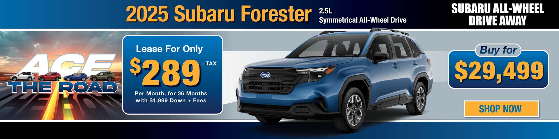 Lease a new 2025 Subaru Forester for $289/month +tax on a 36-month lease (Model SFB01). Due at signing: $1,999 down plus fees. $0 security deposit. MSRP of $31,760 (incl. $1,420 Destination & Delivery charge). Net cap cost of $29,499. Retailer contribution $2,261. Total monthly payments $11,047. Lease end purchase option is $19,373. Must take delivery from Retailer stock by September 30, 2025. Other leases available on other trim levels. Cannot be combined with any other coupon, direct/email offer, or promotional offer unless allowed by that offer. Special lease rates extended to well-qualified buyers. Subject to credit approval, vehicle insurance approval & vehicle availability. Not all buyers may qualify. Payments may be higher in some states. MSRP subject to change and may not apply to all vehicles in retailer inventory. Net cap cost & monthly payment excludes tax, license, title, registration, options, insurance, $699 dealer conveyance fee & other fees. Prices, specifications, options, features, and models subject to change without notice. At lease end, lessee responsible for vehicle maintenance/repairs not covered by warranty, excessive wear/tear, 15 cents/mile over 10,000 miles/year and $300 disposition fee. Lessee pays personal property and ad valorem taxes (where applies) & insurance. Local availability and retailer participation may vary. See Quality Subaru for complete details. ALL PICTURES SHOWN ARE FOR ILLUSTRATION PURPOSE ONLY. ACTUAL VEHICLE MAY VARY. Not responsible for typographical errors. Offer ends 9/30/25.