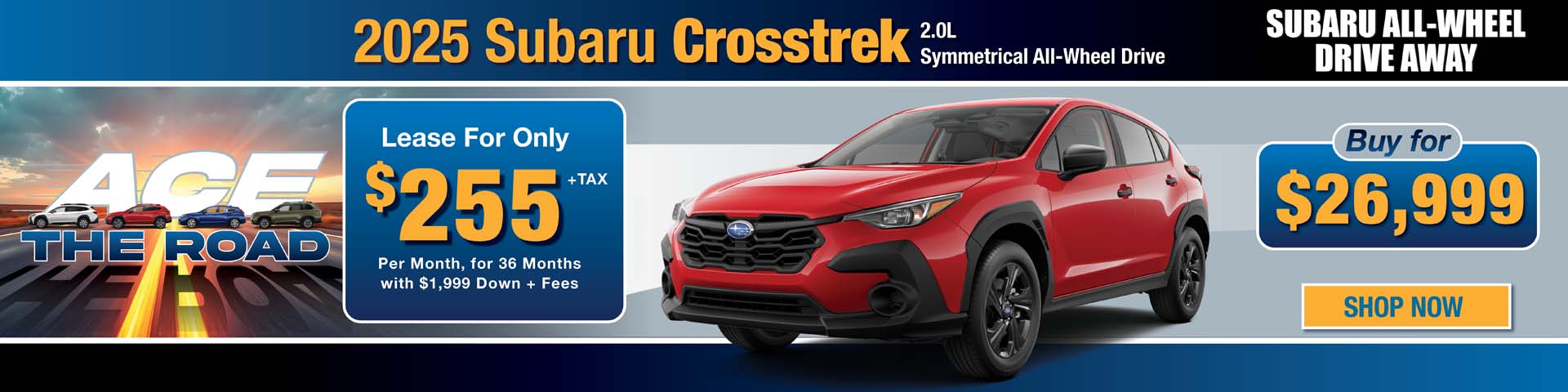 Lease a new 2025 Subaru Crosstrek for $255/month +tax on a 36-month lease (Model SRA03). Due at signing: $1,999 down plus fees. $0 security deposit. MSRP of $28,701 (incl. $1,420 Destination & Delivery charge). Net cap cost of $26,999. Retailer contribution $1,702. Total monthly payments $9,756. Lease end purchase option is $17,507. Must take delivery from Retailer stock by September 30, 2025. Other leases available on other trim levels. Cannot be combined with any other coupon, direct/email offer, or promotional offer unless allowed by that offer. Special lease rates extended to well-qualified buyers. Subject to credit approval, vehicle insurance approval & vehicle availability. Not all buyers may qualify. Payments may be higher in some states. MSRP subject to change and may not apply to all vehicles in retailer inventory. Net cap cost & monthly payment excludes tax, license, title, registration, options, insurance, $699 dealer conveyance fee & other fees. Prices, specifications, options, features, and models subject to change without notice. At lease end, lessee responsible for vehicle maintenance/repairs not covered by warranty, excessive wear/tear, 15 cents/mile over 10,000 miles/year and $300 disposition fee. Lessee pays personal property and ad valorem taxes (where applies) & insurance. Local availability and retailer participation may vary. See Quality Subaru for complete details. ALL PICTURES SHOWN ARE FOR ILLUSTRATION PURPOSE ONLY. ACTUAL VEHICLE MAY VARY. Not responsible for typographical errors. Offer ends 9/30/25.